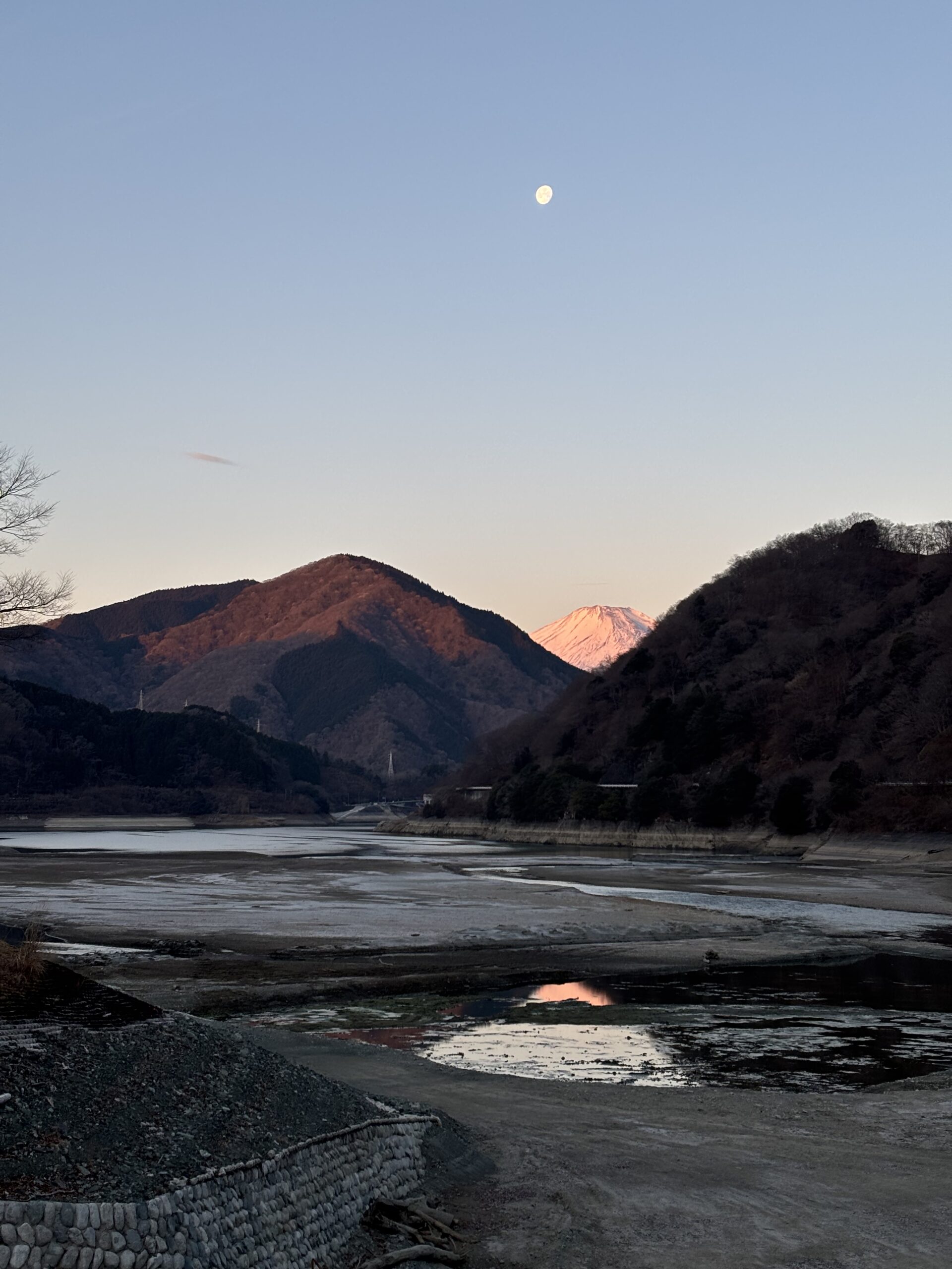 今朝の紅富士と残月
